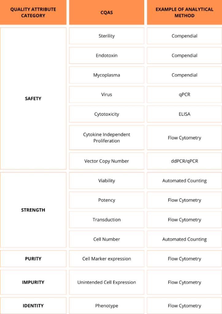 Select appropriate analytical methods: The next step is to select analytical methods to measure CQAs accurately. Initially, it may not be possible to define all methods with precision, as they will evolve alongside the product. These will be adjusted as the product’s characteristics become clearer and more data is collected. The table below is a non-exhaustive list of key Critical Quality Attributes (CQAs) for cell therapies and the analytical methods used for their assessment: