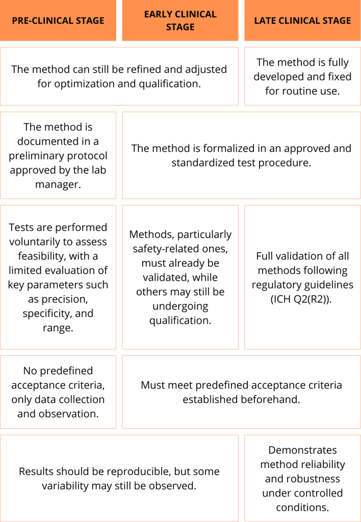 As the product progresses into clinical trials, all methods should be validated following regulatory standards such as ICH Q2(R2). The validation process confirms that critical performance characteristics are well established and compliant with regulatory expectations. Full GMP-grade methods are mandatory during this phase.