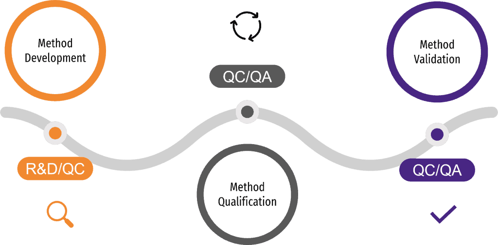 It begins with R&D developing analytical methods tailored to the product’s characteristics and aligned with regulatory expectations. Quality Control (QC) is involved early on to assess feasibility and prepare for a smooth transfer. Once the method is sufficiently mature, it undergoes method qualification to verify key performance attributes such as accuracy and reproducibility under controlled conditions. At this stage, both Quality Control and Quality Assurance (QA) are involved. Subsequently, QC and QA oversee the method validation process, ensuring it meets regulatory standards.